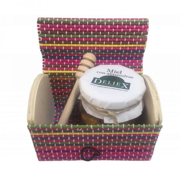 Baúl de colores muy elegante que contiene un tarro de miel 85 gramos yalmendras 15 gramos marca Deliex y un palo pequeño catador medida 10,5 cm