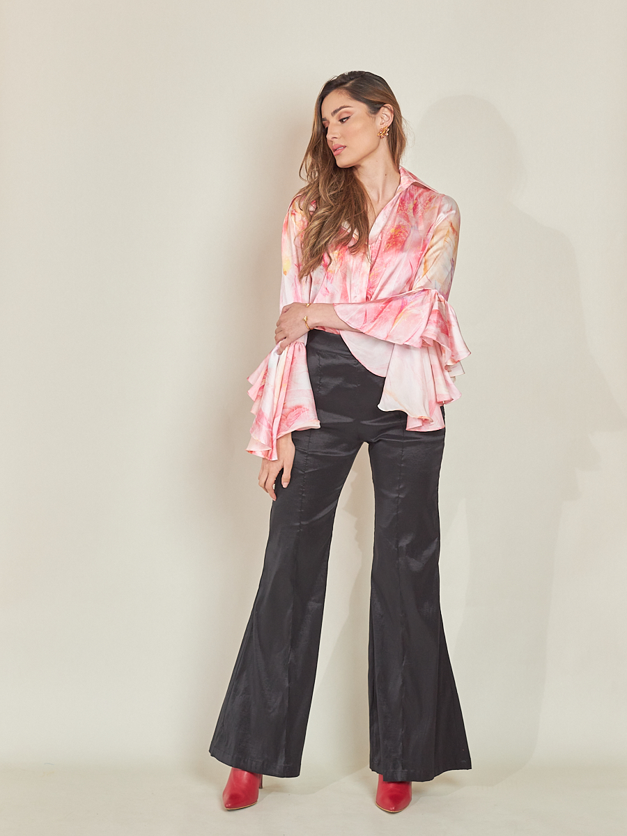 Blusa estilo camisero con cuello y manga larga en bolero y campana. Abotonadura en el frente. Es muy versátil y funciona para múltiples ocasiones.