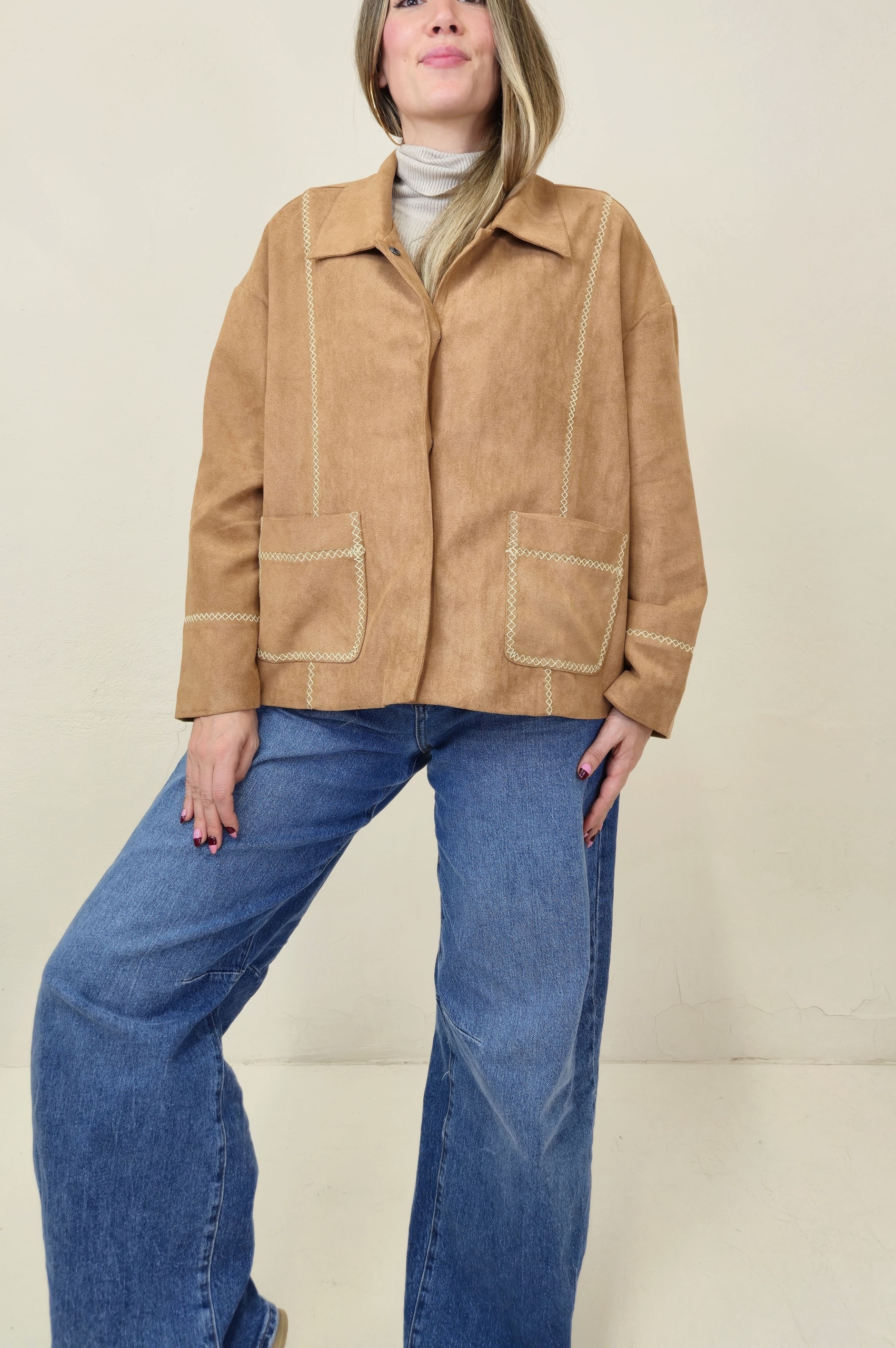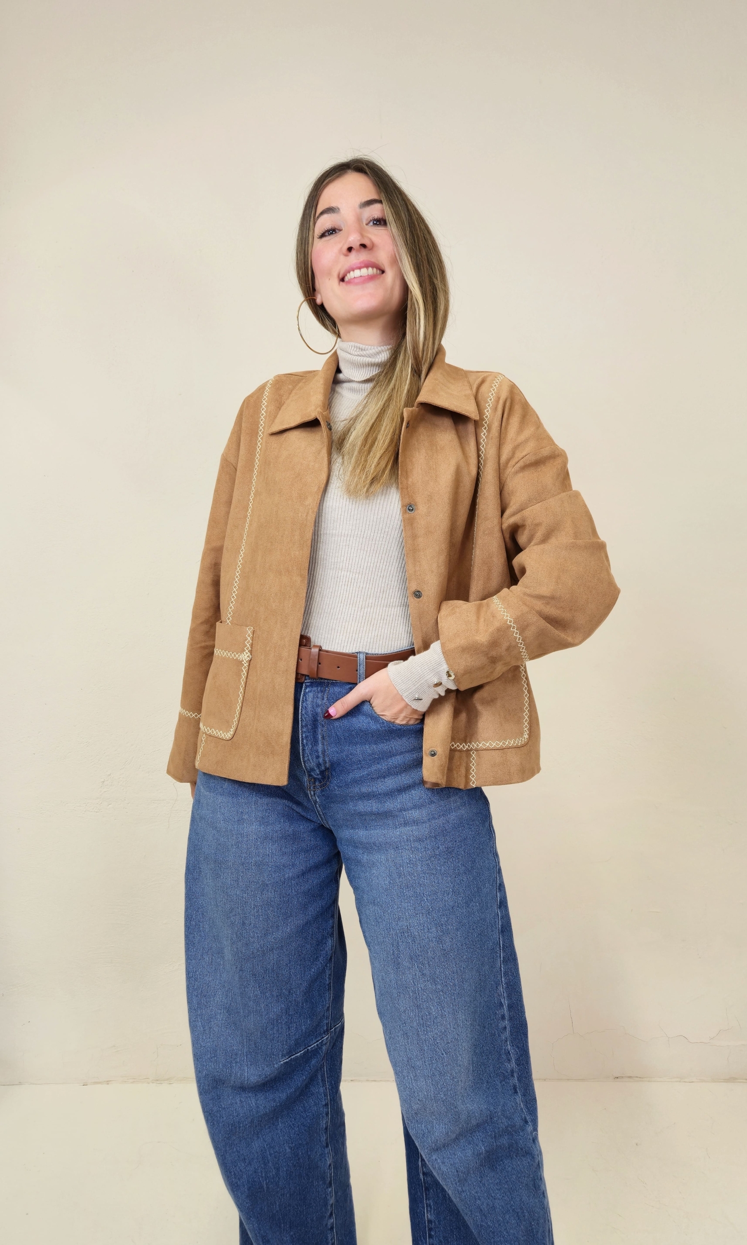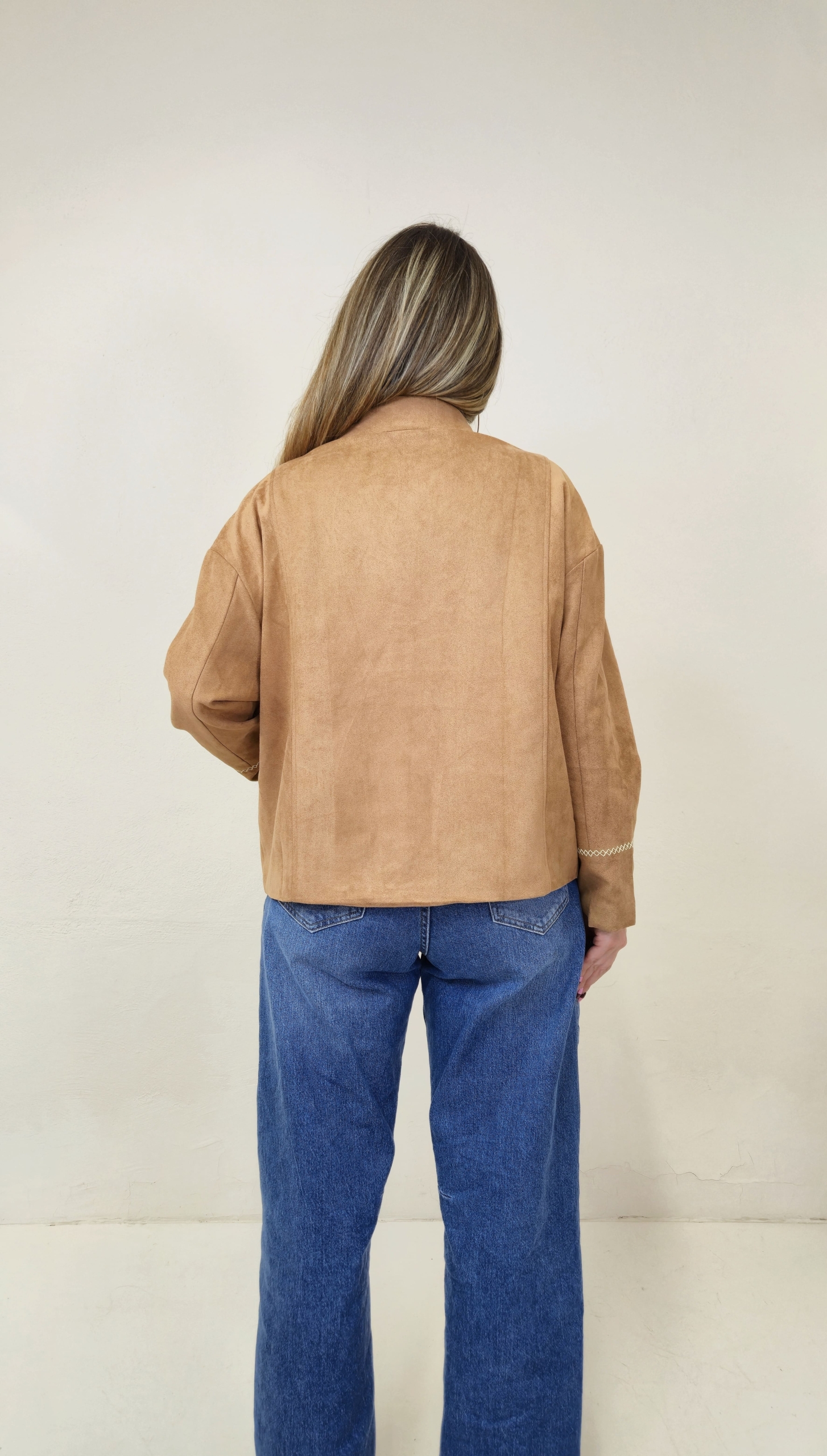 Chaqueta tipo blazer tejido antelina color marrón camel.