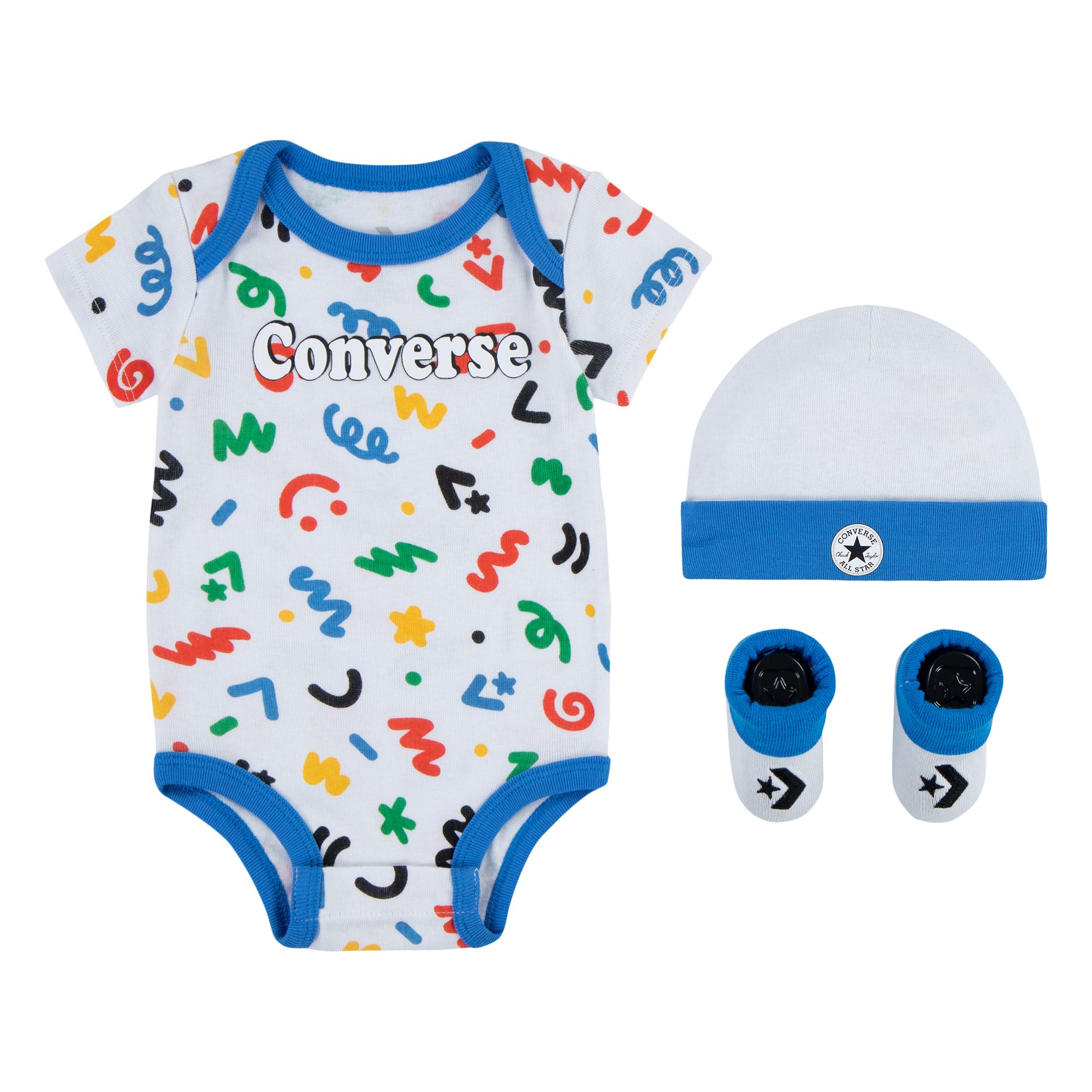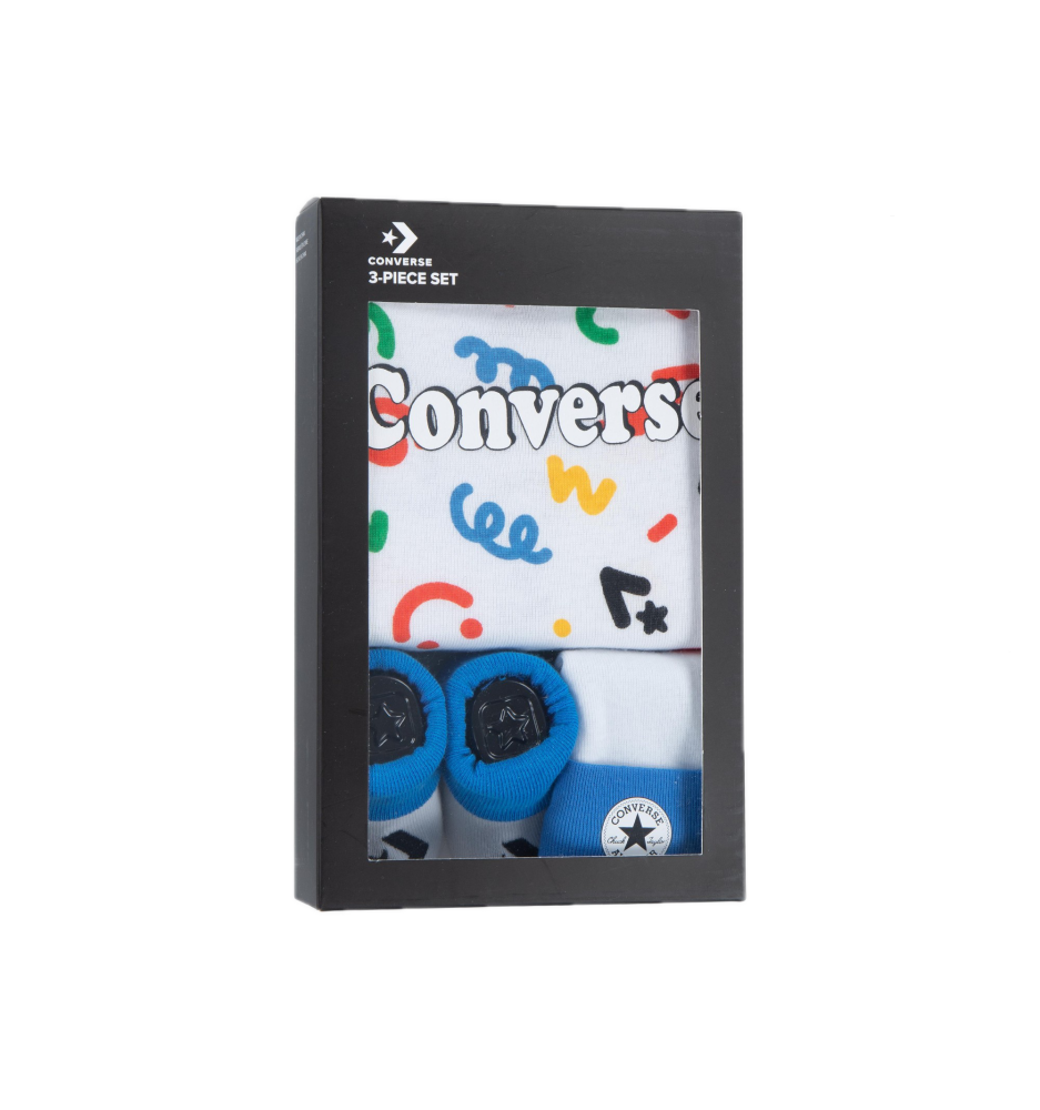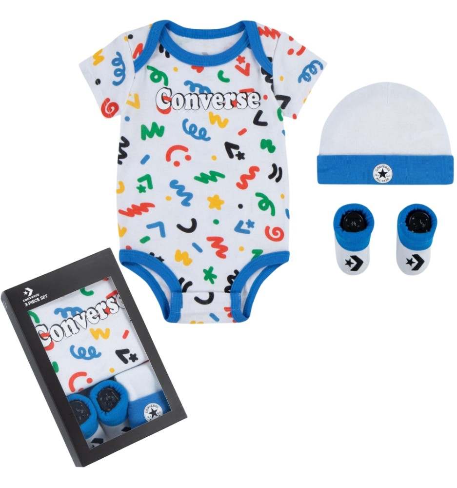 Este conjunto de bebé Converse de 3 piezas es una opción ideal para quienes buscan un regalo bonito, práctico y de marca reconocida para bebés de 6 a 12 meses. Presentado en una cuidada caja lista para regalar, incluye body de manga corta, gorro y patucos a juego. Su diseño blanco con estampado de colorines y logo Converse aporta un estilo moderno, alegre y unisex, perfecto para vestir al bebé con comodidad y estilo desde sus primeros meses. 👶✨