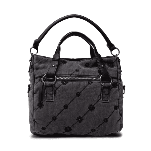🧵 Bolso Desigual algodón denim gris mujer con bordados exclusivos, estilo bohemio chic atemporal.
