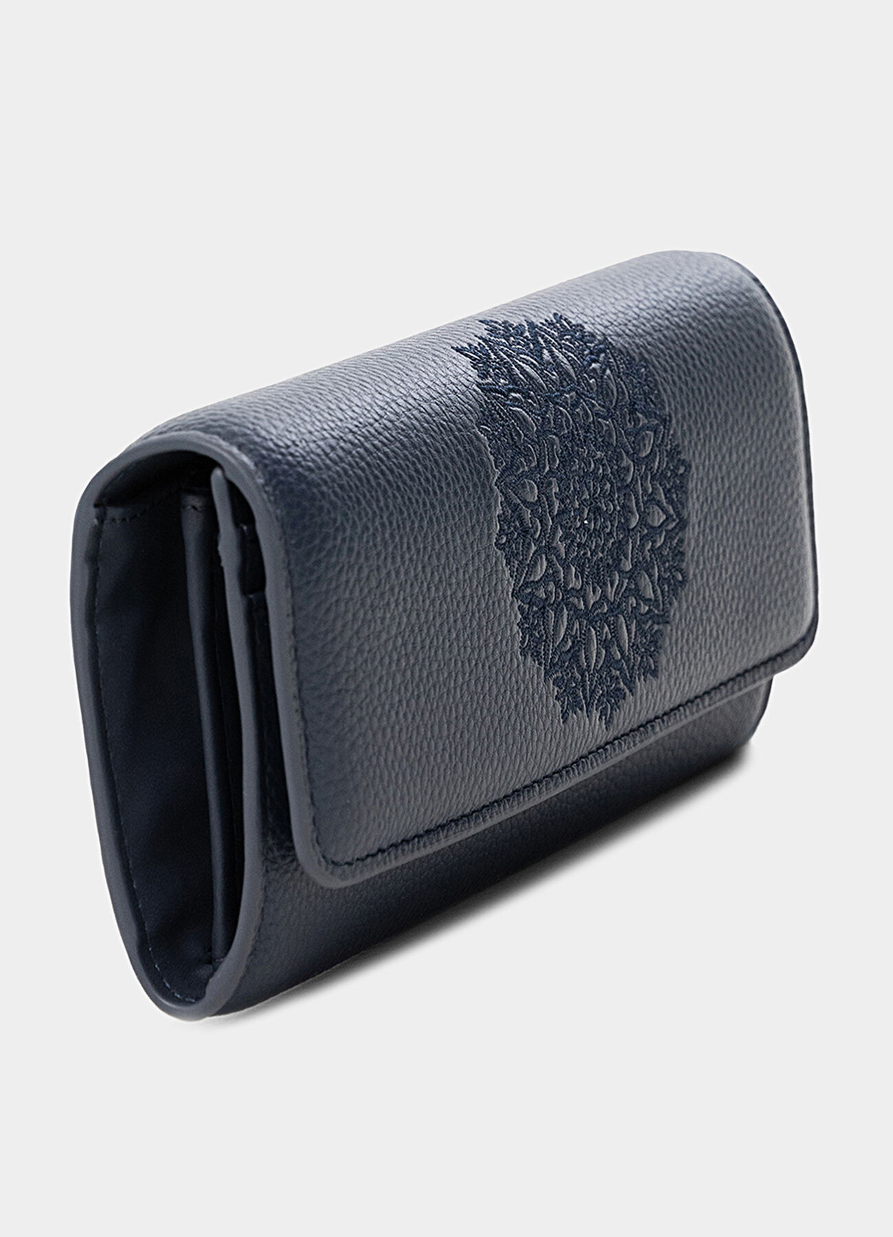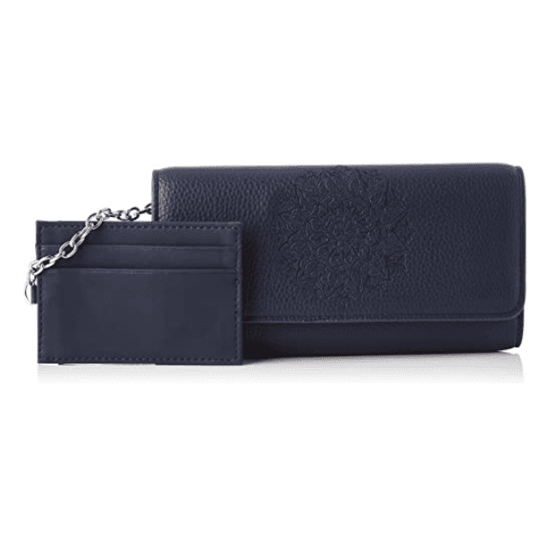 - 💙 Monedero largo Desigual para mujer en color azul marino con mandala bordado decorativo.