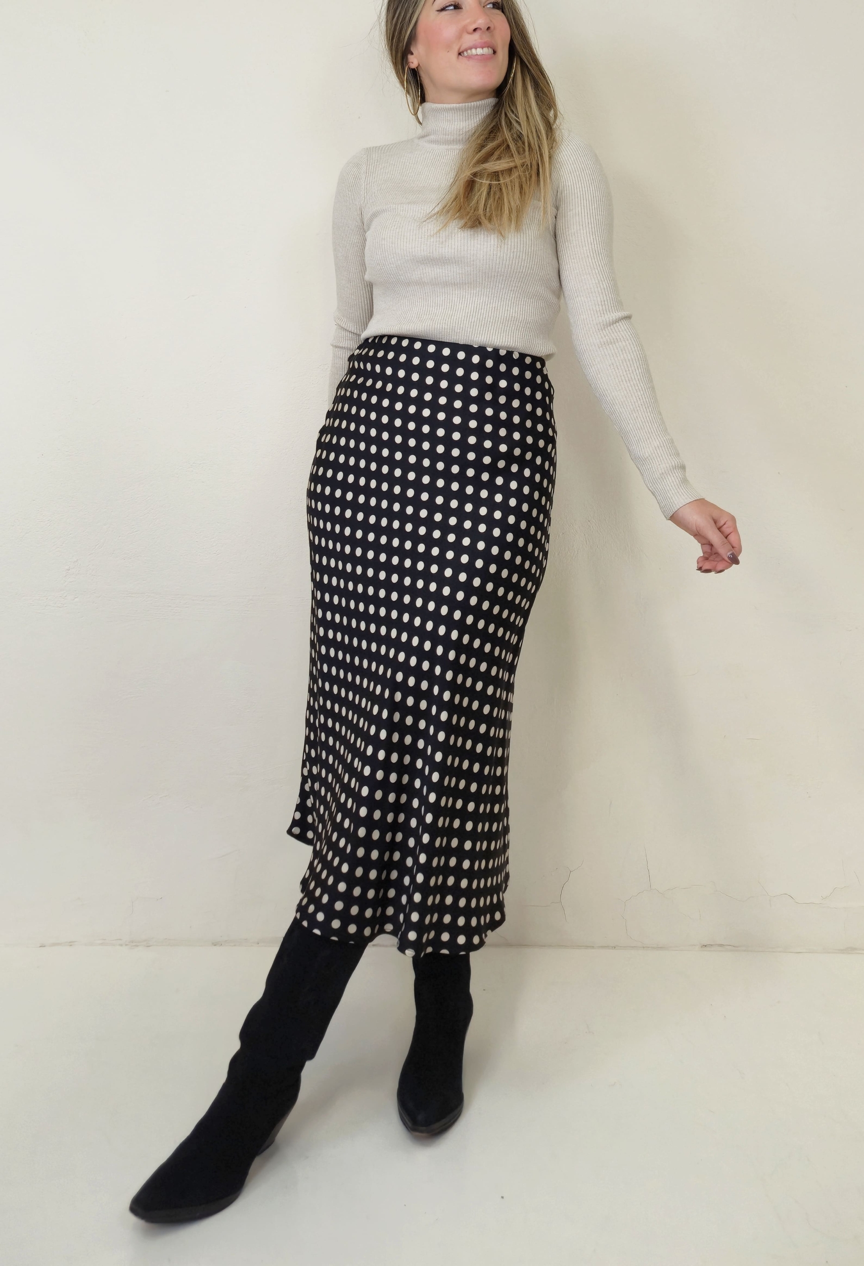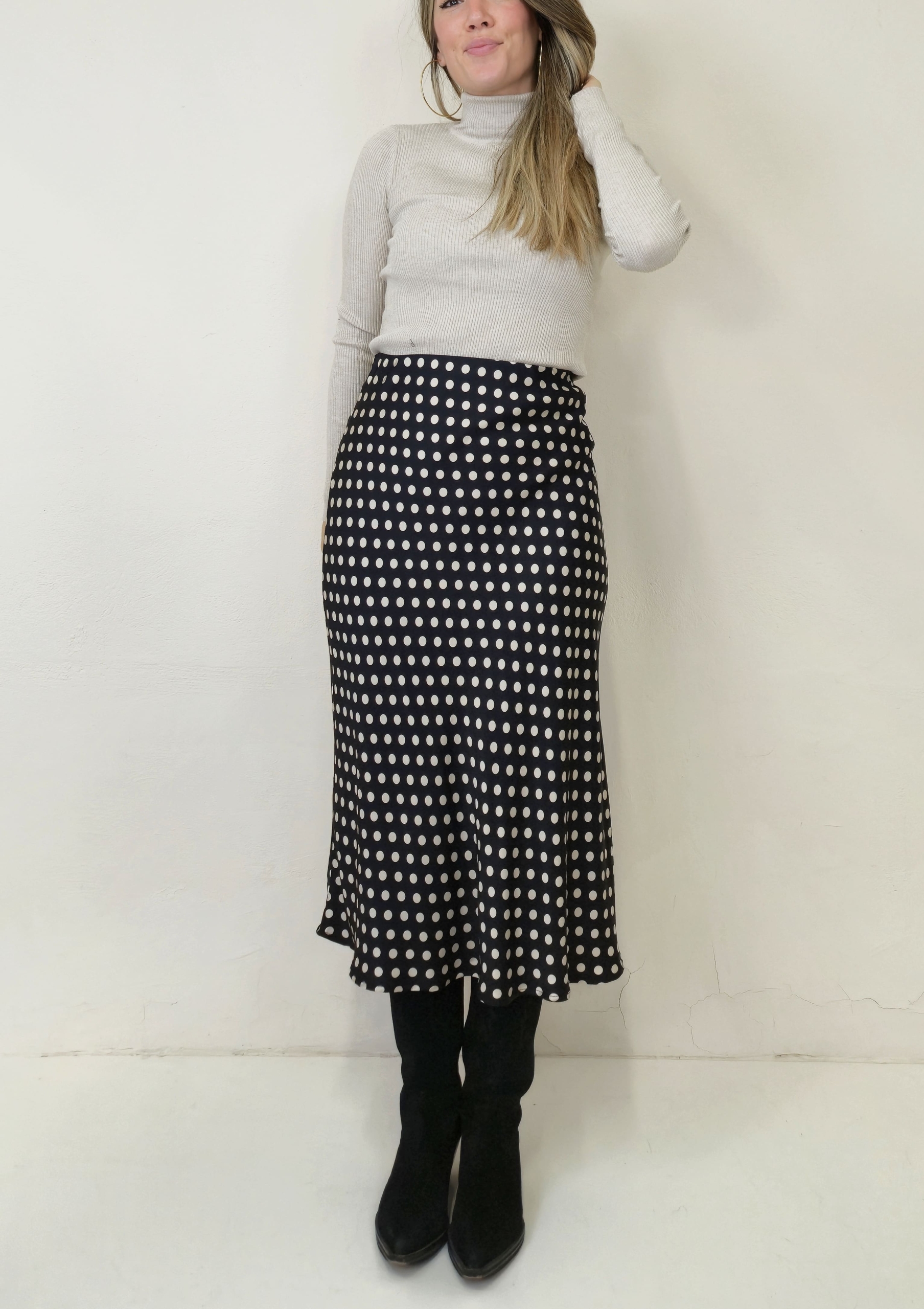 Falda negra con lunares color champán, confeccionada en tejido satén de acabado suave y elegante.