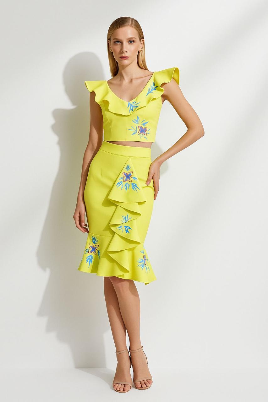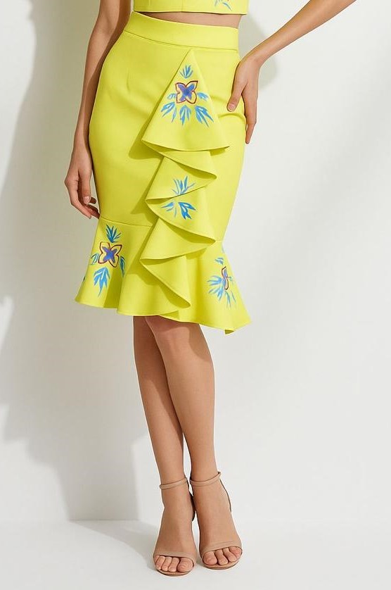 La falda es una pieza de diseño elegante y llamativa. Es de corte midi, ajustada en la cadera y con un detalle de volantes en cascada al frente, que le aporta movimiento y un aire sofisticado.