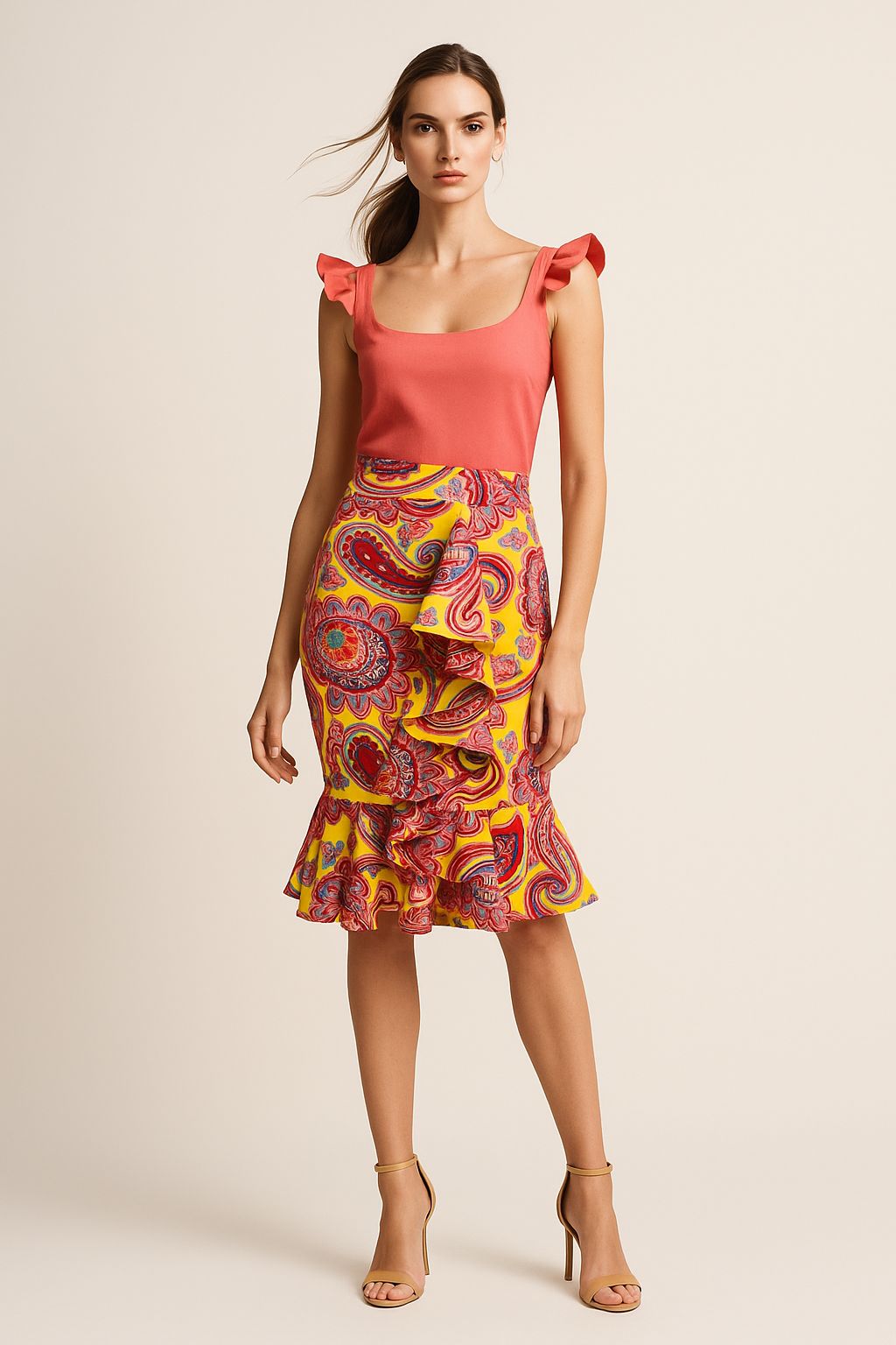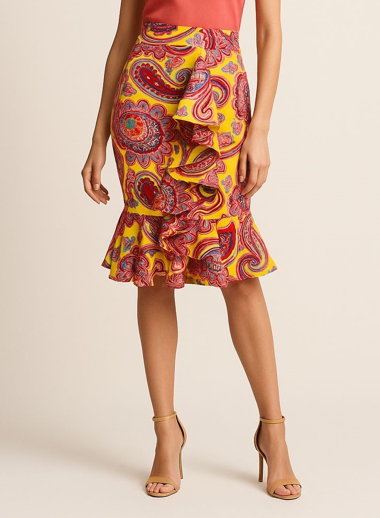 La falda es una pieza de diseño elegante y llamativa. Es de corte midi, ajustada en la cadera y con un detalle de volantes en cascada al frente, que le aporta movimiento y un aire sofisticado.