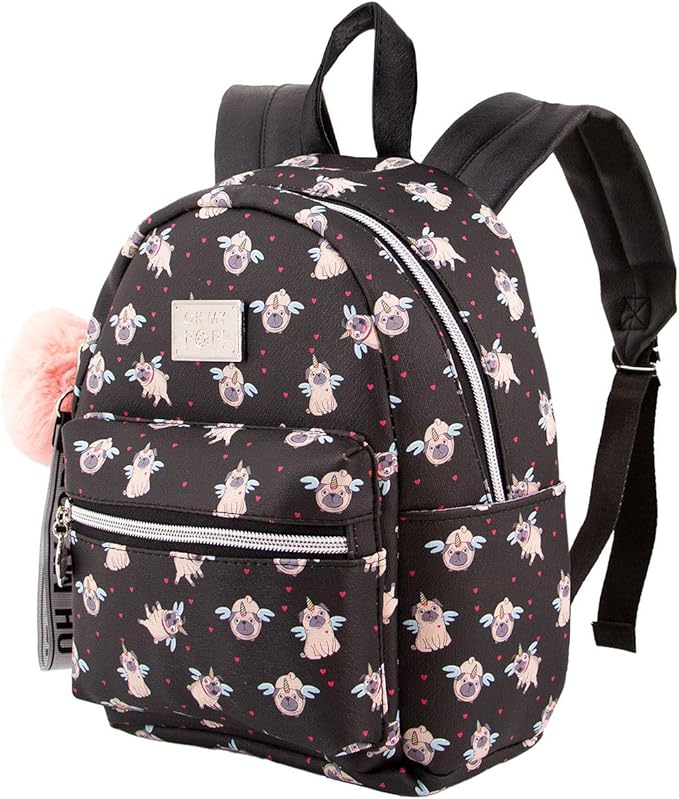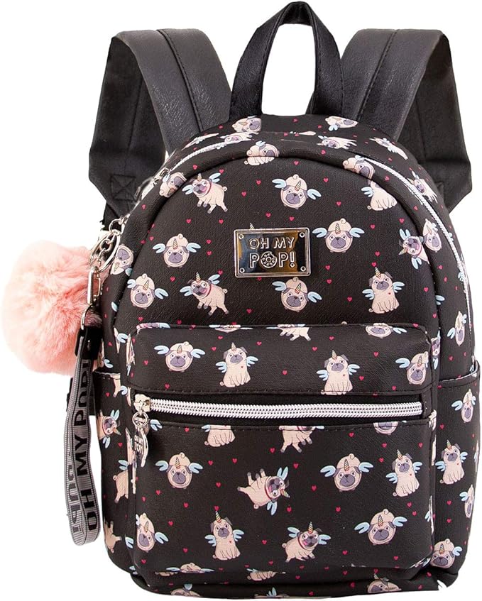 La Mochila OH MY POP! Pug Kawaii Negra es una monada irresistible para niñas pequeñas amantes de los perritos y la moda kawaii. Con estampado de bulldog adorable, pompón rosa y llavero de regalo, es perfecta para el colegio, guardería, excursiones o como regalo original de cumpleaños.