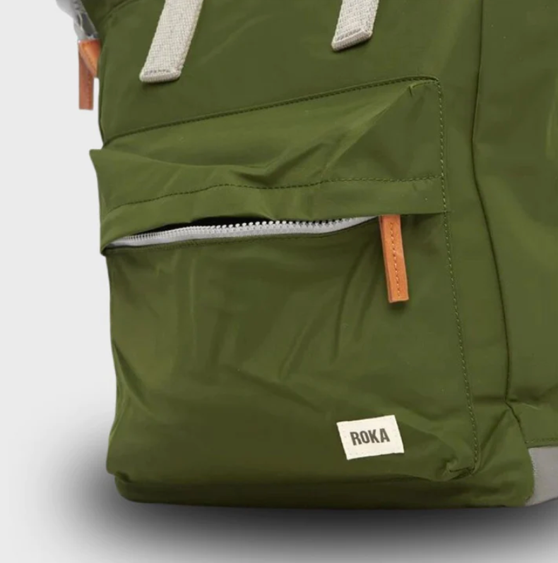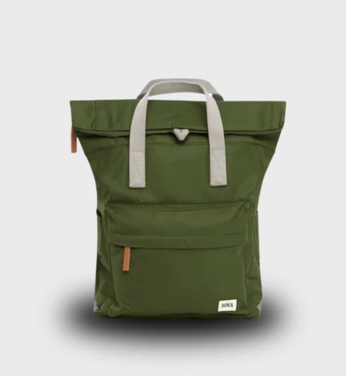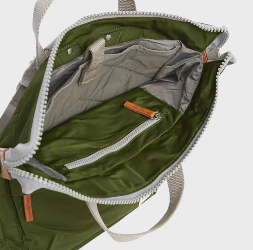 El Bantry viene en opciones de lona reciclada y nailon reciclado. El nailon tiene un aspecto brillante y un tacto suave, y el lienzo tiene un aspecto texturizado y un tacto mate.