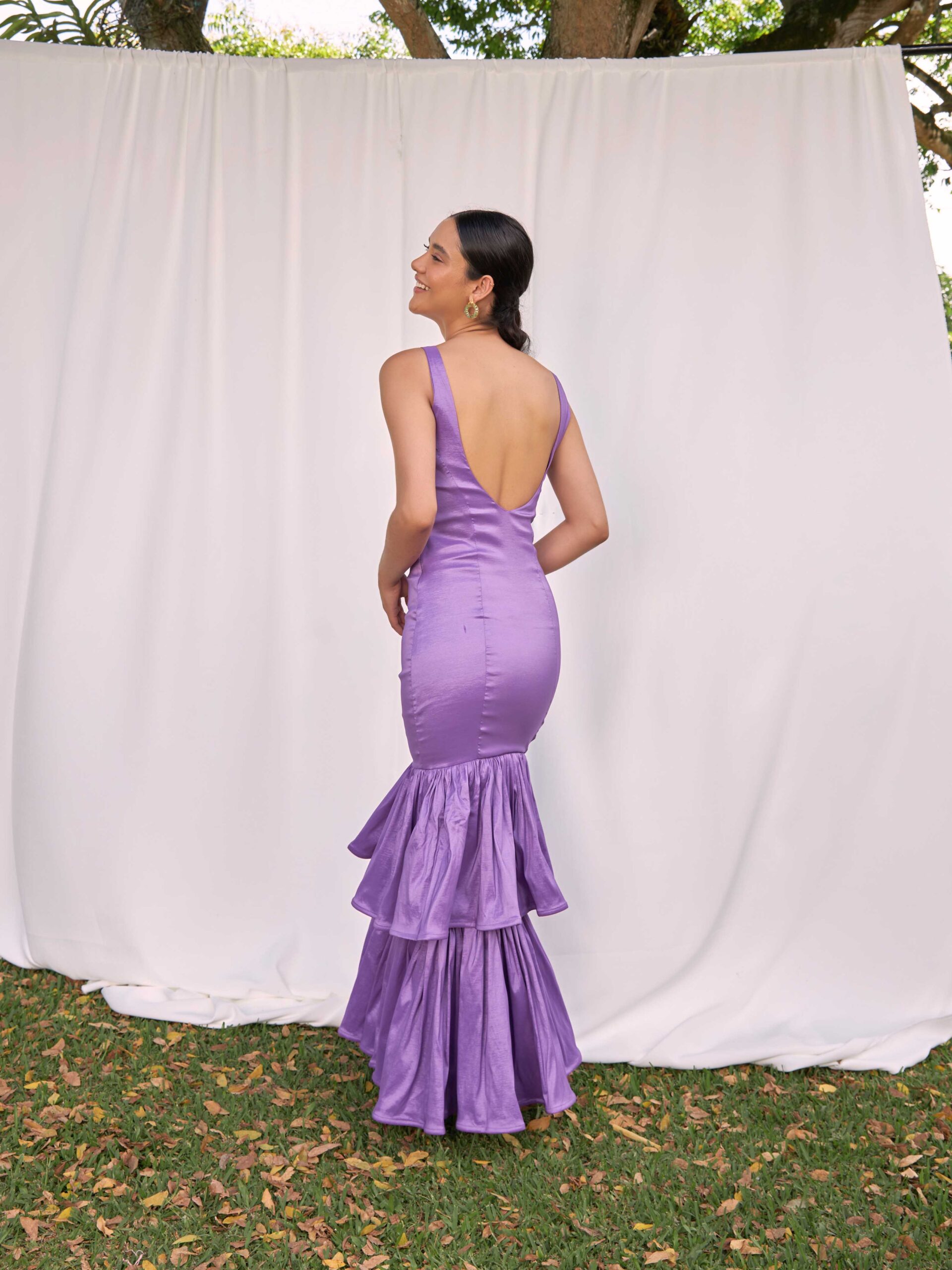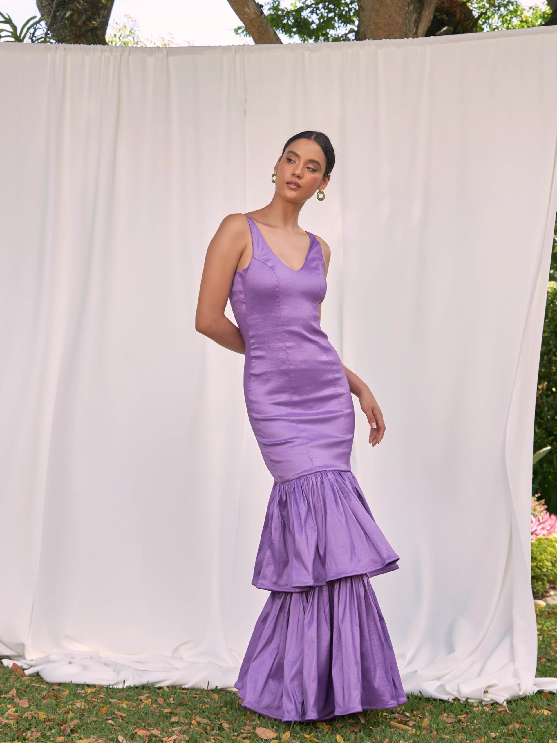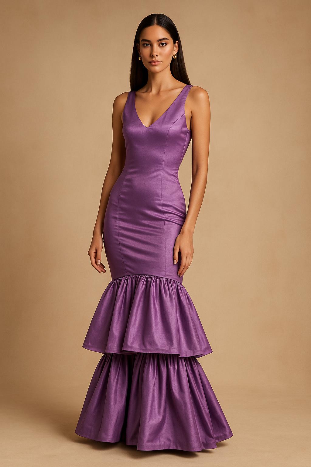 Vestido largo en tafeta ajustado al cuerpo, con dos boleros en la falda. Cremallera invisible.