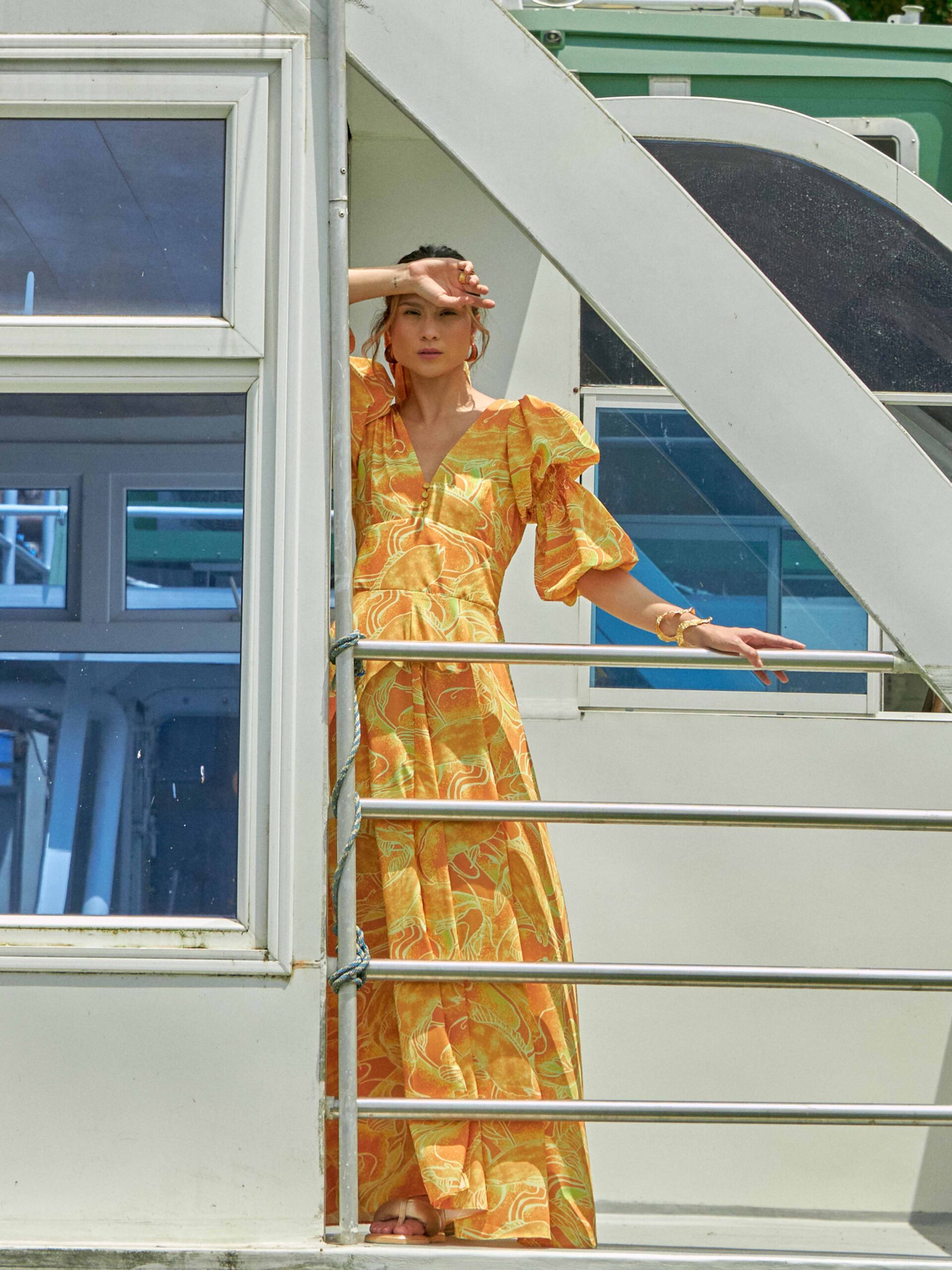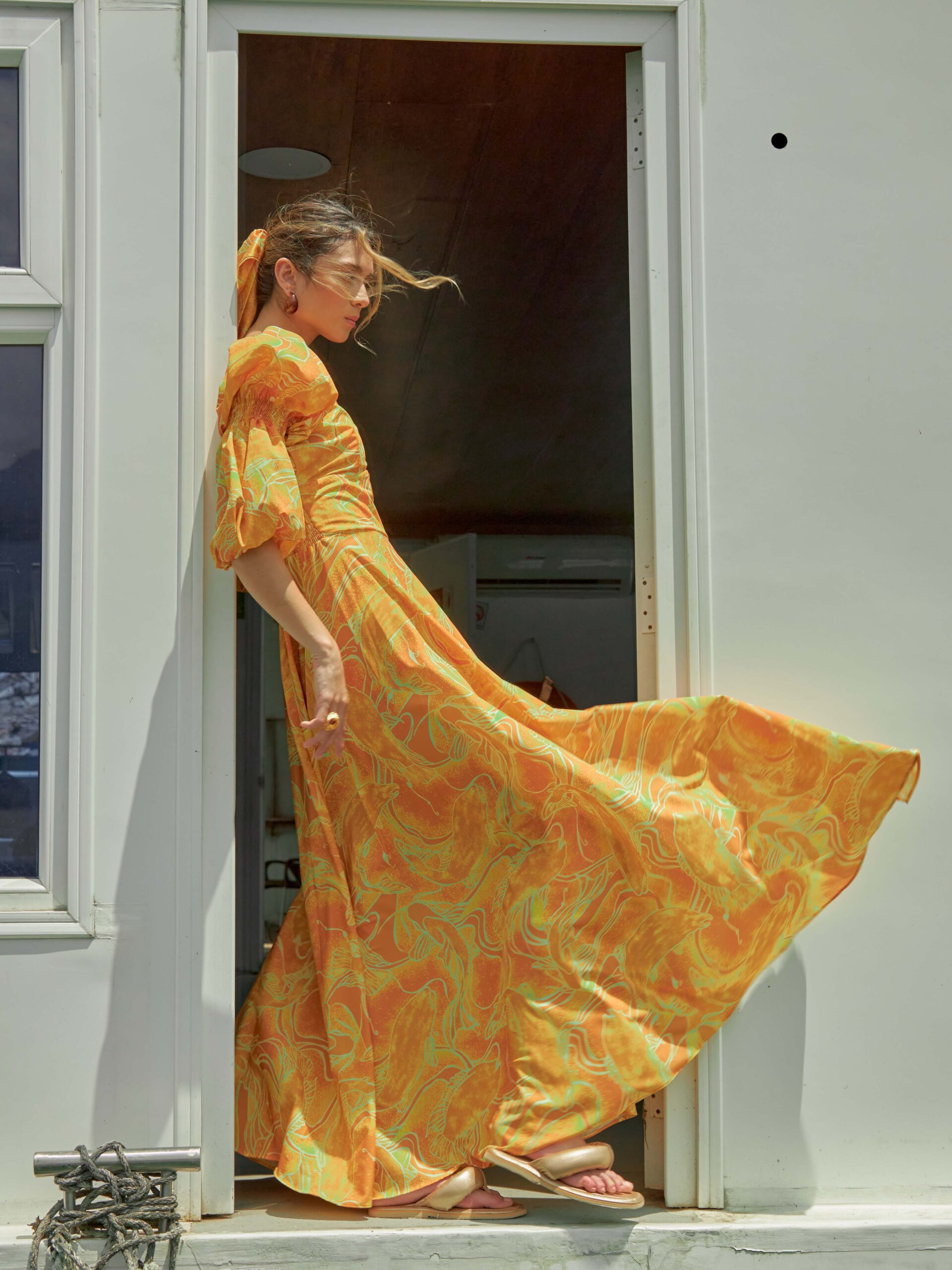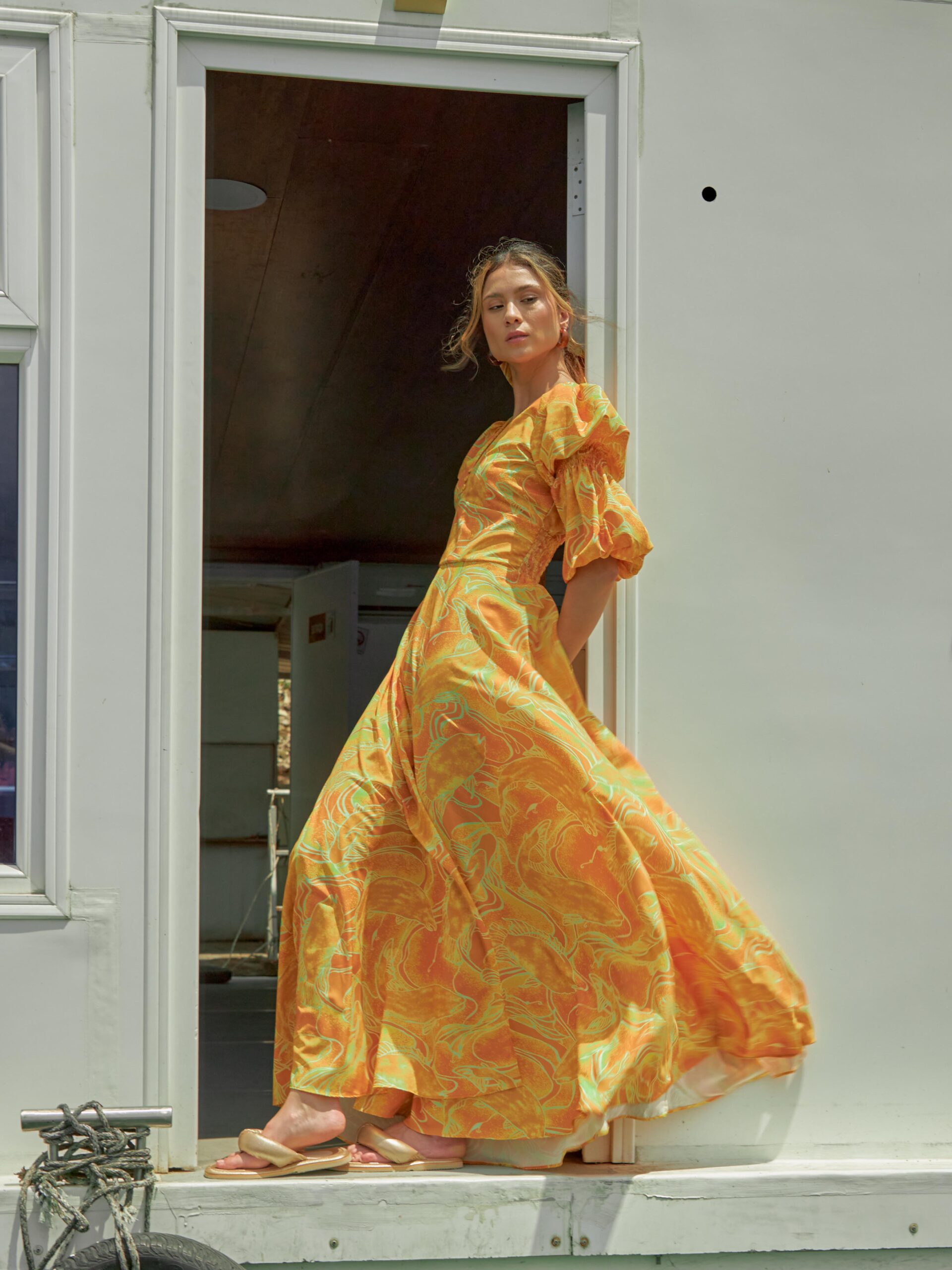 Vestido manga larga con abertura en un costado. Cremallera a un costado.